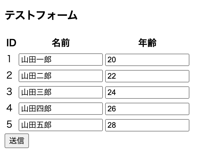 例として、以下のフォームのように複数の同じ入力値に対してバリデーションをします。