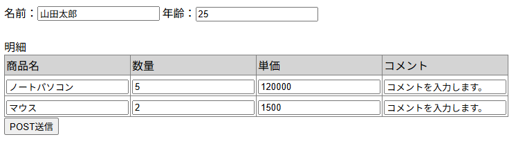 フォームをPOSTすると、上記のように明細ごとに情報がまとまった「縦持ちの配列」が来ることを想定しています。