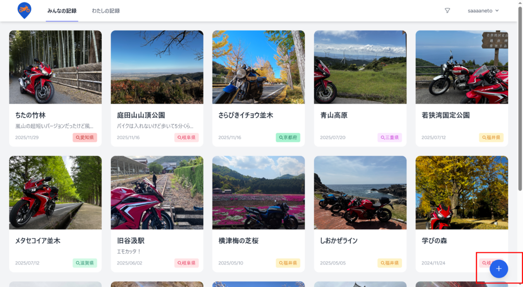 また、右下の「+ボタン」(投稿ボタン)から新しい記録の投稿ができます。