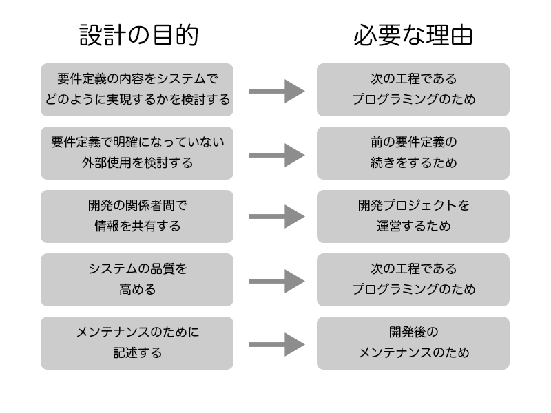 設計の目的とは 2023 2/17 設計 2022-12-212023-02-17 目次設計の目的 要件定義の内容をシステムでどのように実現するかを検討する 要件定義で明確になっていない外部仕様を検討する 開発の関係者間で情報を共有する システムの品質を高める メンテナンスのために設計情報を残す 設計 URLをコピーしました! Wordpress ドメインの変更 超簡単なハンバーガーメニュー 関連記事 CSV出力で確認すべき7項目! 2025-11-26